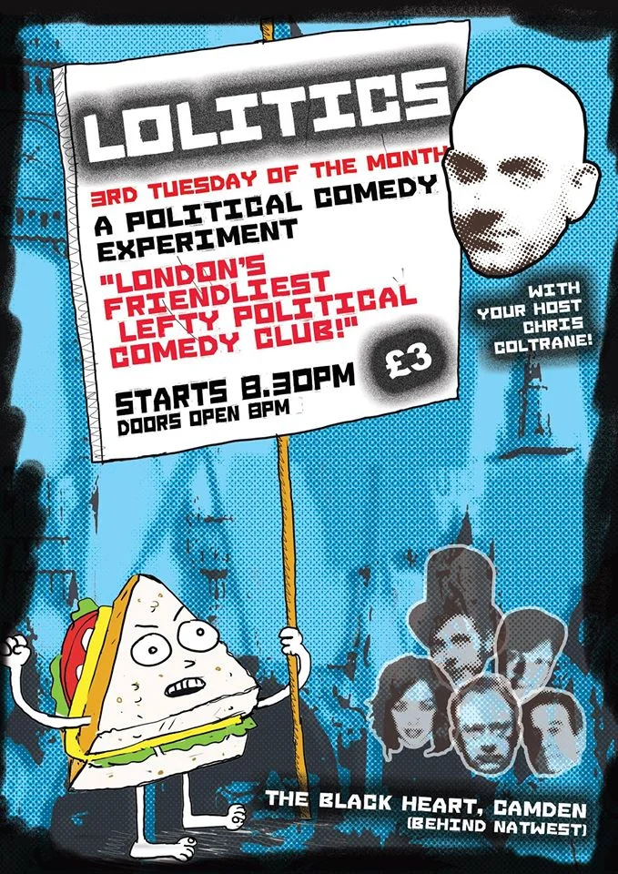 I run a gig called Lolitics in Camden, for... new political material. It's very friendly and fun, there's competitions and prizes and zines and happiness. Like this page to find out when the next dates are, and subscribe to the podcast: http://itunes.apple.com/gb/podcast/chris-coltrane-and-lolitics/id516435278
