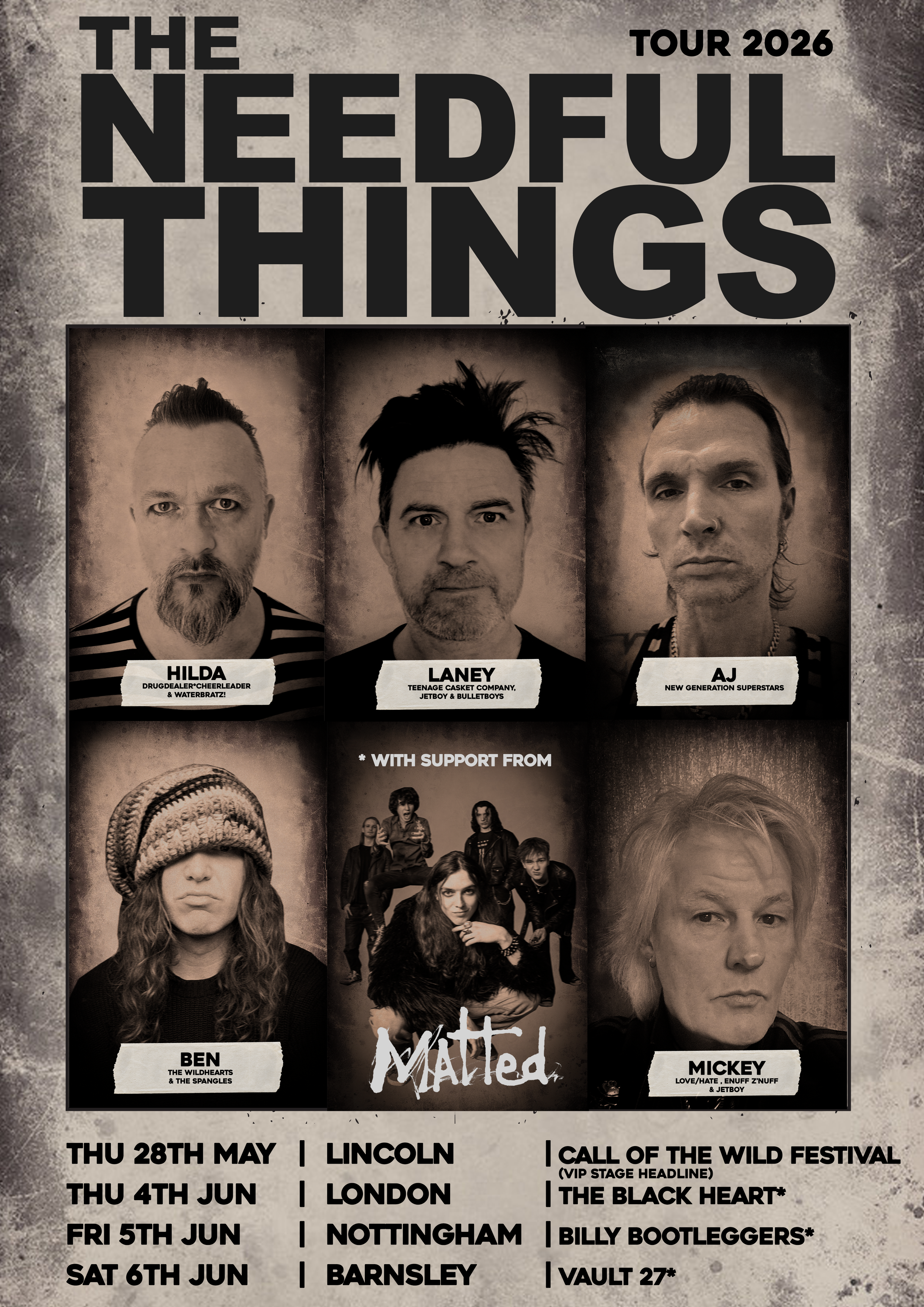 The Needful Things are an 'underground supergroup' features members of - The Wildhearts, The Spangles, New Generation Superstars, Teenage Casket Company, Love/Hate, Jetboy, Drugdealer Cheerleader, Waterbratz!, and Enuff Z’nuff. The band will be smashing out an hour of material from all of these bands and more!